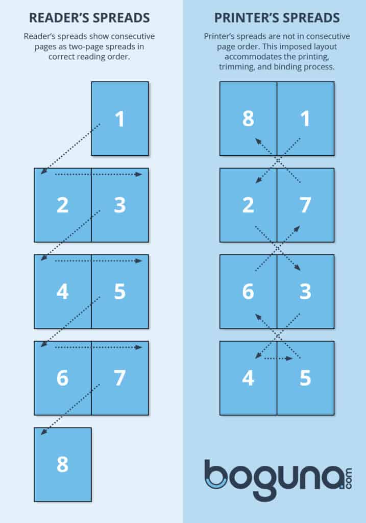 In summary, reader's spreads are about the natural, intended reading order of the pages in a booklet, while printer's spreads are about arranging pages in a special order for printing, so everything comes together perfectly in the final product. It's like the difference between reading a story in order and assembling the pages of the story so they can be bound into a book.