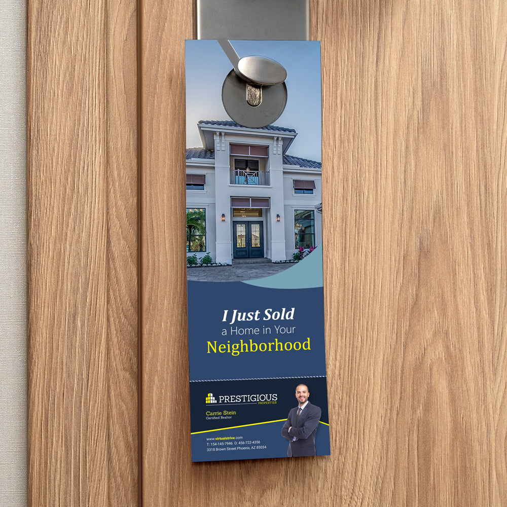 Printed in full color on sturdy cardstock and die-cut to hang on standard doors, they make a strong first impression and are hard to ignore. Add optional perforated tear-off coupons or business card sections for even more engagement. Ideal for restaurants, real estate agents, contractors, medical offices, political campaigns, home services, schools, fitness studios, nonprofits, and anyone looking for hyper-local marketing that actually gets noticed.